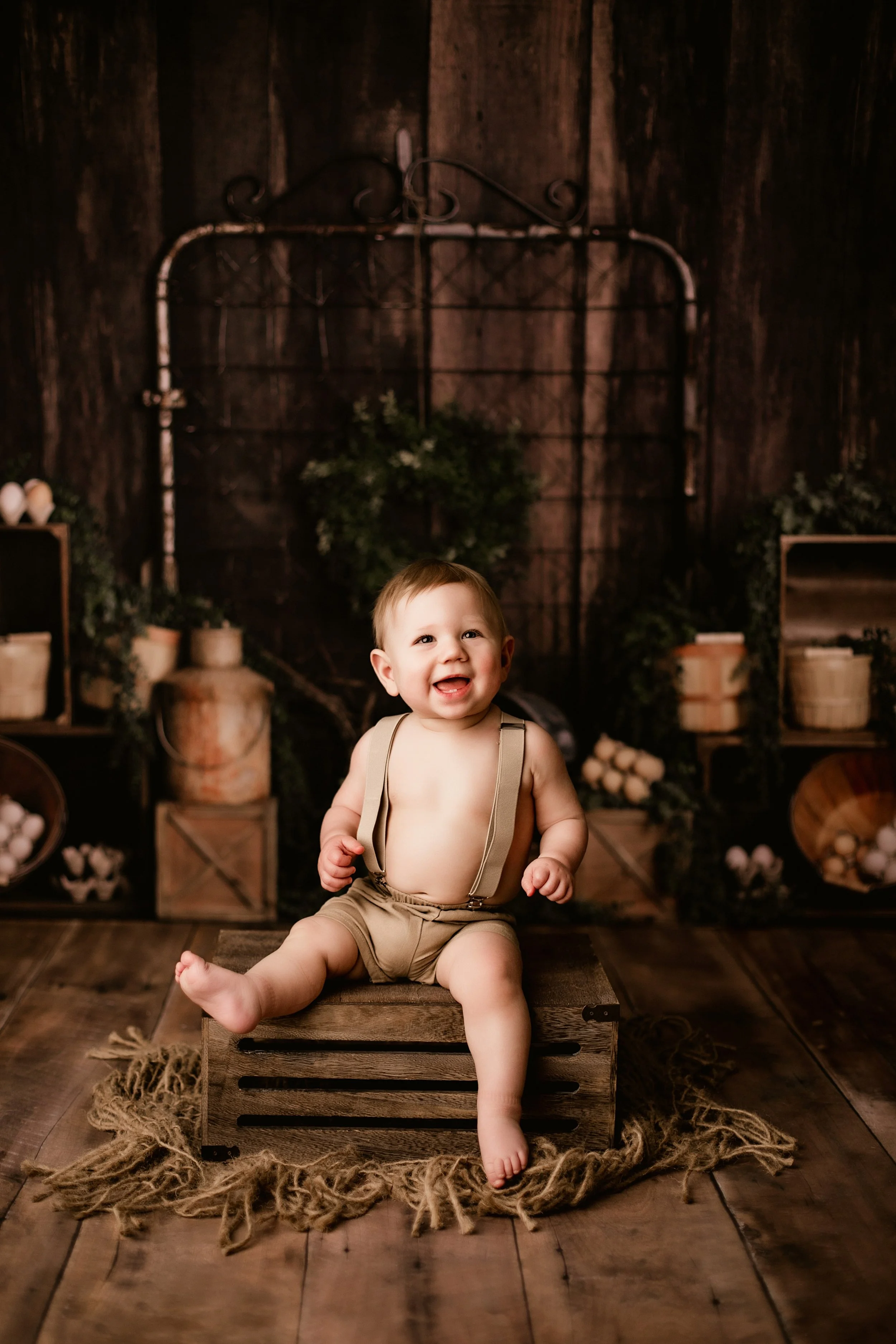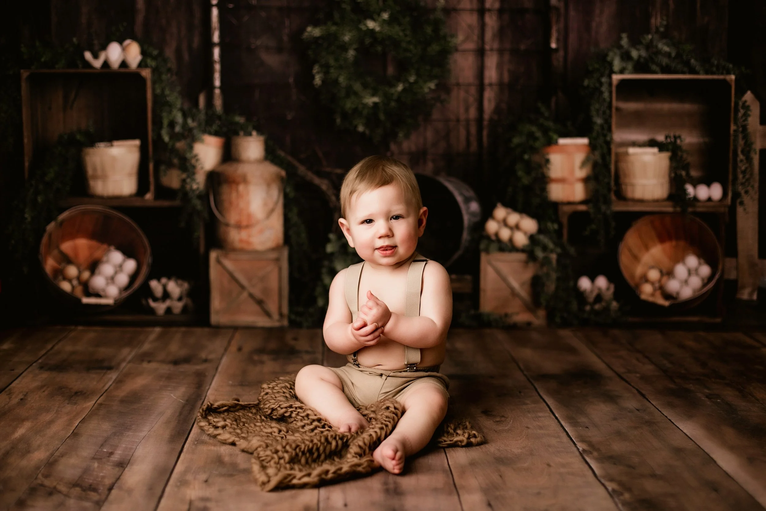 This little guy came in for his one-year milestone session, and I couldn’t get over how adorable he looked in those tiny suspenders. (Seriously, who doesn’t love a baby in suspenders?) His outfit came straight from my client closet, and it was the perfect rustic touch to match the warm, textured backdrop we used in the studio. I love offering clients access to hand-selected wardrobe pieces so they don’t have to stress over what to bring—it’s one less thing to worry about, especially when you're already juggling snacks, naps, and wrangling little ones.
